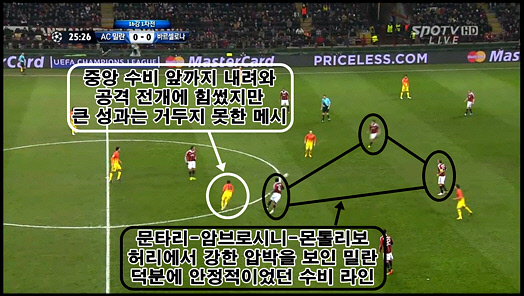 73%의 점유율, 91%의 패스 성공률이 뒷받침된 바르샤의 경기 운영은 볼을 빼앗기지 않을수록 상대에게 공격 기회가 덜 돌아가고, 그들 스스로 수비를 덜 할 수 있게 된 만큼 경기 전체를 본인들의 페이스에 맞게 능동적으로 운영해 나간다는 것이 핵심이다. 볼 소유를 좀처럼 내주지 않는 팀을 상대로 침착히 기다리면서 압박을 가하는 것이 심리적으로도 상당히 피곤할 일, 그런데 '엄청난 집중력'이 가미된 밀란의 커팅력은 그 이상이었다. 암브로시니를 받친 문타리-몬톨리보 라인은 때로는 중앙 수비 앞에 바짝 붙어 수비 대형을 꾸렸고, 때로는 높은 선으로 전진해 커팅을 시도했다. 허리 진영의 공간을 잘 컨트롤하며 '자물쇠'가 된 이들 덕분에 후방의 수비진은 한층 더 안정됐다.