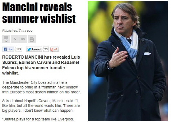 로베르토 만시니 맨시티 감독이 올여름 영입을 원하는 선수 목록을 밝혔다. 주인공은 리버풀의 루이스 수아레스, 나폴리의 에딘손 카바니, 아틀레티코 마드리드의 라다멜 팔카오다. 모두 공격수라는 것이 눈에 띈다.