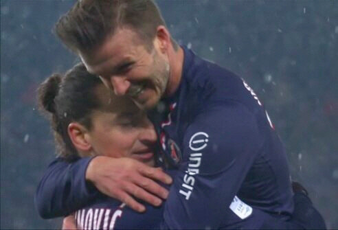 데이비드 베컴(38, 파리 생제르맹)이 프랑스 무대 데뷔전에서 동료 즐라탄 이브라히모비치의 득점에 기여하며 그에게 안겼다.