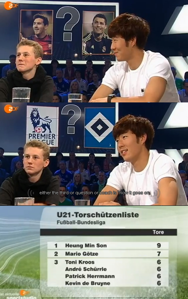 손흥민은 올시즌 분데스리가에서 9골을 기록하고 있다. 방송은 1990년부터 리그에서 활약한 21세 유망주들의 득점 현황을 보여주면서 손흥민이 마리오 괴체(도르트문트), 토니 크로스(바이에른 뮌헨) 등 기존 스타들의 과거 활약상을 앞질렀다고 전해 방청객의 큰 갈채을 유도했다. <스포츠조선닷컴>