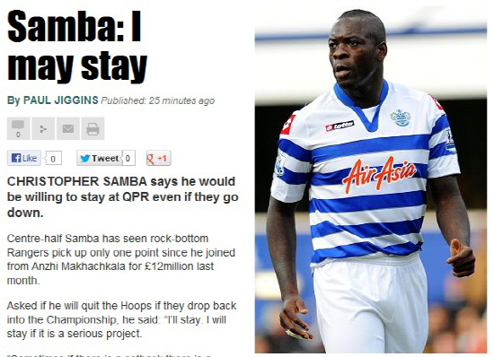 QPR 역사상 최고 몸값으로 이적한 크리스토퍼 삼바의 말이다. 삼바는 1월이적시장에서 1200만파운드의 이적료로 안지를 떠나 QPR 유니폼을 입었다. 많은 기대를 모았지만 예상과 달리 QPR은 삼바 영입 후 승점 1점만을 얻는데 그쳤다. 그는 이에 대한 책임감이 있었다. 삼바는 '팀이 챔피언십(2부리그)로 추락할 경우 어떻게 할것인지'에 대한 질문에 26일(한국시각) 영국 일간지 더선을 통해 "난 잔류할 것이다"며 "때때로 더 큰 전진을 위한 후퇴가 있다. 나는 기꺼이 이를 함께 할 것이다"고 했다.