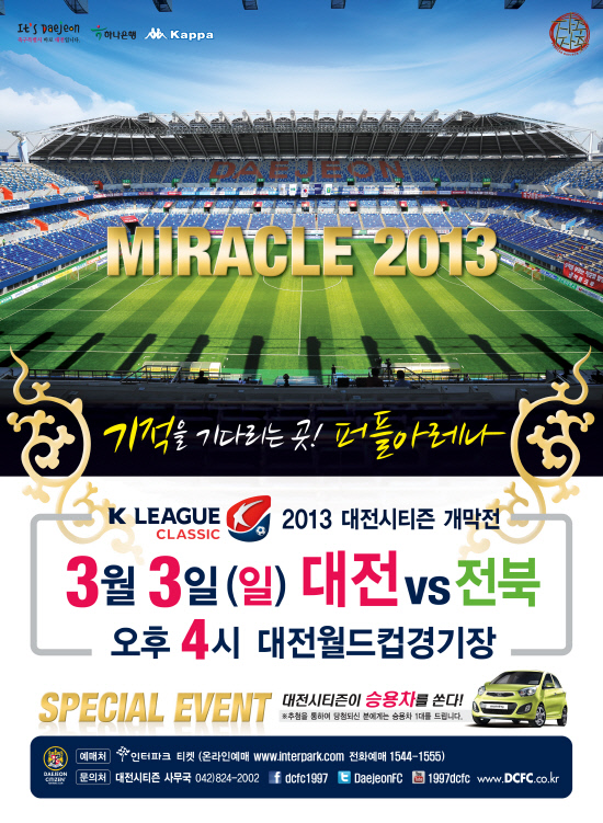 경기 하프타임에는 대전의 2013년 K-리그 클래식 개막전을 맞아 하나은행 충청사업본부에서 마련한 기아자동차 '모닝'이 추첨을 통해 관람객에게 선물된다. 그 외에도 갤러리아타임월드, 아모레퍼시픽, 리솜스파캐슬 등 대전 후원사들이 준비한 경품이 관람객에게 쏟아진다.