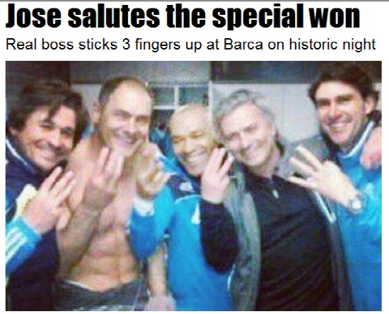 28일(이하 한국시각) 영국 일간지 더선은 무리뉴 감독이 27일 있었던 바르셀로나와의 2012~2013시즌 스페인국왕컵(코파 델 레이) 2차전에서 3대1로 완승을 거둔 후 바르셀로나 라커룸에서 손가락 3개를 피고 찍은 기념사진을 보도했다. 손가락 3개는 3골을 의미하는 것이다. 레알 마드리드가 바르셀로나 원정에서 2골차 이상의 승리를 거둔 것은 2002년 4월 유럽챔피언스리그 4강 1차전(2대0 승)이 마지막이었다.