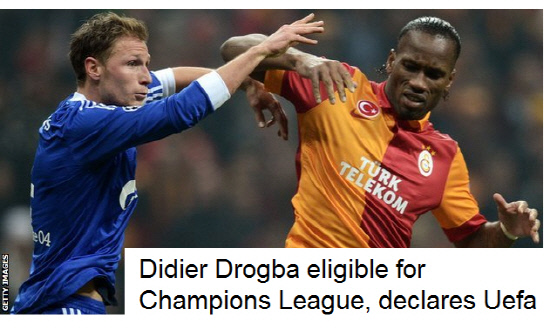 영국 일간지 BBC는 28일(한국시각) '유럽축구연맹(UEFA)가 샬케04가 드로그바의 유럽챔피언스리그 출전이 적법한 절차를 거쳤는지 의문을 제기한 것에 대해 아무런 문제가 없다는 판단을 내렸다. UEFA는 드로그바가 정해진 기간 안에 유럽챔피언스리그 출전 선수 등록을 마쳤다고 밝혔다'고 보도했다.