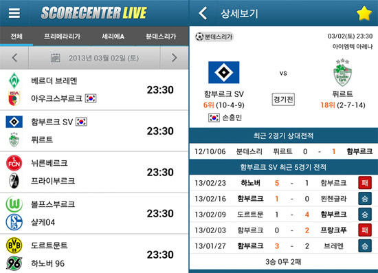 스포츠 실시간 결과 알림 어플리케이션 '스코어센터 LIVE'가 3.1절을 맞이해 전격 업데이트를 실시했다. 이름 하여 태극전사 업데이트! 이제 해외에서 활약 중인 태극전사들의 경기를 스코어센터 LIVE에서 한눈에 확인할 수 있게 됐다.