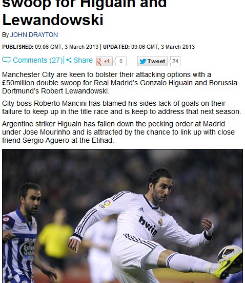 맨시티가 공격수 보강을 위해 5000만파운드를 준비했다. 타깃은 곤살로 이과인(레알 마드리드)와 로베르토 레반도프스키(도르트문트)다.