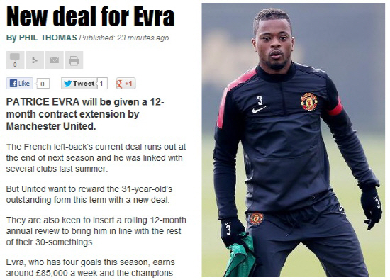 5일(한국시각) 영국 일간지 더선은 맨유가 최근 들어 좋은 활약을 펼치는 에브라와 계약 연장을 원하고 있다고 보도했다. 맨유는 30세 이상 선수들과 1년씩 계약 연장을 하는 것을 비추어볼때 이번 재계약 제시안도 1년이 될 것으로 보인다.