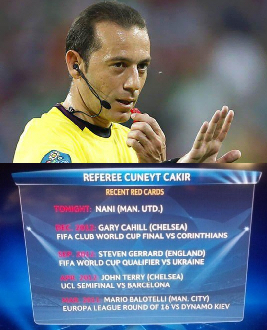 레알 마드리드와 맨체스터 유나이티드의 챔피언스리그 경기를 통해 스타 심판으로 떠오른 터키 쥐네이트 카차르(36) 주심의 화려한 레드카드 이력이 주목받고 있다.
