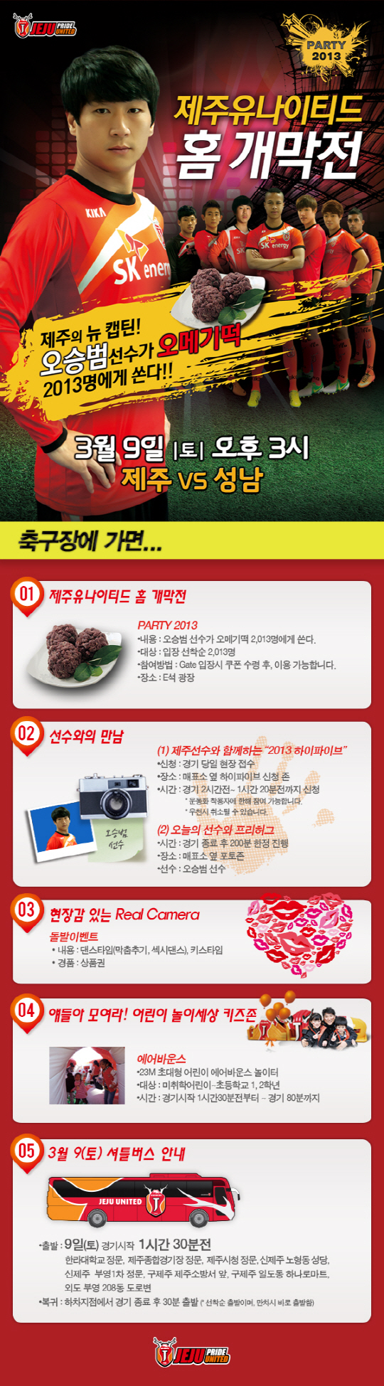 이에 올 시즌 제주는 팬들의 사랑에 보답하기 위해 더욱 풍성하고 업그레이드된 이벤트를 준비했다. 'Party 2013'이라는 새로운 슬로건 아래 홈 구장인 제주월드컵경기장을 맛과 즐거움이 가득한 축제의 장소로 변신시켰다.