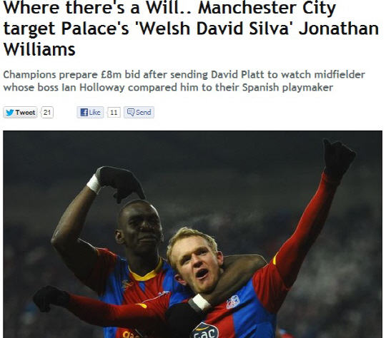 8일(한국시각) 영국 일간지 데일리미러는 로베르토 만시니 맨시티 감독이 크리스탈 팰리스의 미드필더 조나단 윌리엄스 영입에 큰 관심을 보이고 있다고 보도했다. 맨시티는 윌리엄스의 영입을 위해 800만파운드의 이적료를 준비했다. 리버풀과 스완시지티도 윌리엄스에게 러브콜을 보내고 있지만, 현재 맨시티가 레이스에서 한 걸음 앞서 있는 형국이다.