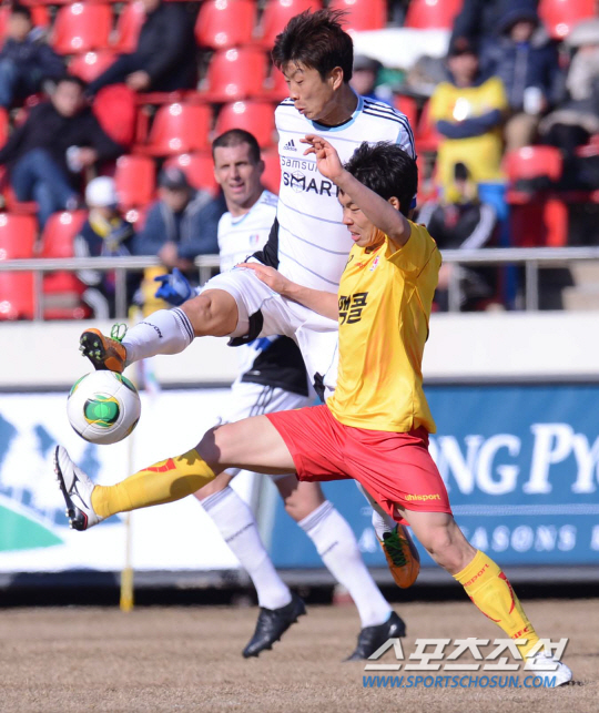 | ◇수원 김두현(왼쪽)이 강원FC전에서 결승골을 터뜨리면서 팀 승리를 견인했다. 지난 3일 성남 탄천종합운동장에서 열린 성남 일화전에 출전했던 김두현이 볼을 다투고 있다. 성남=최문영 기자 deer@sportschosun.com |