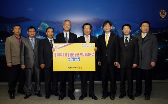 광주는 12일 광주월드컵경기장 사무처에서 교통안전공단과 협약을 맺고 지역 내 관람 활성화 및 교통안전 캠페인을 공동 진행하기로 했다. 이번 협약에 따라 교통안전공단은 교차로 전광판과 지역사업소에 광주 홈 경기 일정 등을 연간 고지한다. 광주는 안전띠 매기와 운전 중 휴대폰 사용 금지 등의 교통안전 수칙을 지역 축구팬들에게 홍보하고 각종 이벤트를 통해 교통안전에 앞장 설 방침이다.