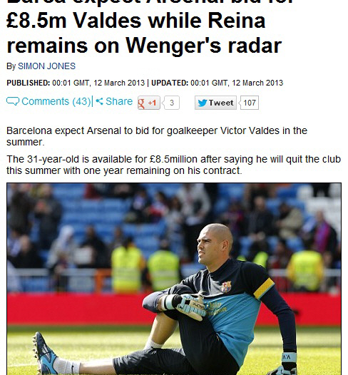 13일(한국시각) 영국 일간지 데일리메일은 아스널이 바르셀로나의 빅토르 발데스 영입을 노리고 있다고 보도했다. 발데스는 올시즌을 끝으로 바르셀로나를 떠나 해외에서 선수생활을 이어가겠다고 했다. 골문 보강을 노리는 아스널은 발데스 영입에 흥미를 보이고 있다. 아스널은 기존의 보이체흐 슈체스니 골키퍼가 불안한 모습을 보이고 있어 새 골키퍼 영입이 시급하다. 바르셀로나는 발데스의 몸값으로 850만파운드로 설정해놓은 상태다.