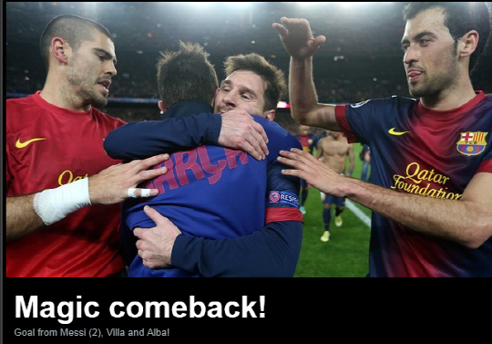 메시는 그가 왜 특별한 선수인지 유감없이 뽐냈다. 메시는 13일(한국시각) 스페인 바르셀로나의 누캄프에서 펼쳐진 AC밀란과의 2012~2013시즌 유럽챔피언스리그 16강 2차전에서 2골을 뽑아내며 팀의 4대0 완승을 이끌었다. 1차전 0대2 패배로 다득점 승리가 절실했던 바르셀로나는 1, 2차전 합계 스코어 4대2로 AC밀란을 꺾고 극적으로 6시즌 연속 8강 진출에 성공했다. 메시는 전반 5분만에 AC밀란 수비수 5명 사이를 비웃듯 강력한 왼발슈팅으로 첫골을 뽑아냈다. 전반 39분에도 안드레스 이니에스타의 패스를 드리블 뒤 멋진 왼발 슈팅으로 마무리했다. 메시의 활약에 힘입어 2-0 스코어로 전반을 마친 바르셀로나는 후반에도 공세를 늦추지 않았다. 후반 10분 다비드 비야의 골로 1차전 2골차 패배를 역전 시킨 후 인저리타임 호르디 알바의 4번째 골이 터지며 완벽한 승리를 마무리했다.