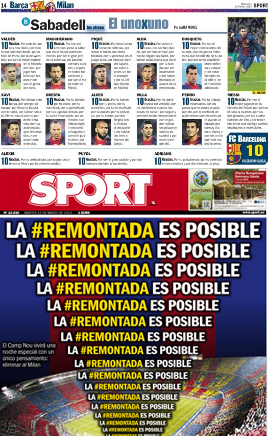 '스포르트'는 경기 당일 발간 신문 1면을 통해 "(바르셀로나의) 부활은 가능하다"는 헤드라인을 17차례나 반복하는 파격을 선보이기도 했다.