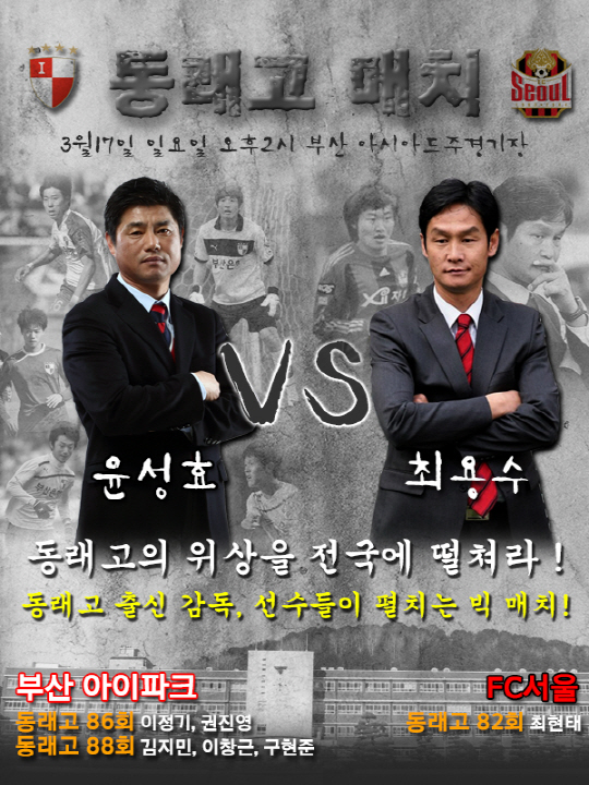K-리그 클래식에서 활약하는 동래고 출신 감독만 해도 세 명이다. 주인공은 김호곤 울산 감독, 윤성효 부산 감독, 최용수 FC서울 감독이다. 이 중 17일 오후 2시 부산아시아드경기장에서 두 지도자가 충돌한다. 윤 감독과 최 감독이다. 부산과 서울이 2013년 K-리그 클래식 3라운드에서 맞붙는다.