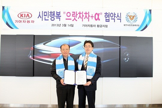 대구FC(대표 김재하)와 기아자동차 대구지역본부(본부장 이재영)는 14일 기아자동차 황금지점에서 협약을 결, 기아자동차 대구지역본부는 대구FC 매 홈경기에 '으랏車車+α' 행사 용으로 '모닝' 1대'를 경품으로 후원하며, 홈경기 단체 응원등을 통해 대구FC와 함께 하기로 했다. 대구FC는 홈경기장 내 광고 등을 통해 기아자동차를 홍보키로 협의했다.