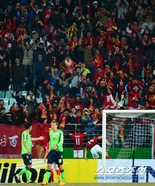 광저우의 무리퀴가 동점골을 넣고 응원단 앞으로 달려가자 광저우 응원단이 열광하고 있다. 전주=정재근 기자 cjg@sportschosun.com
