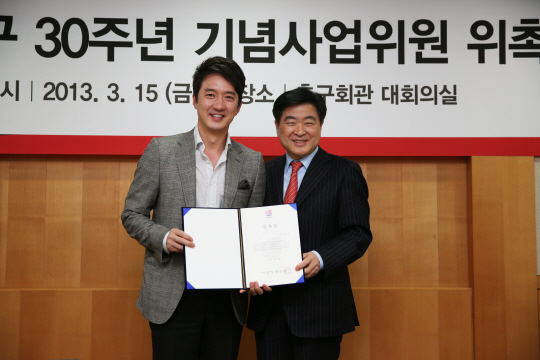 15일 서울 신문로 축구회관에서 열린 프로축구 30주년 기념사업위원 위촉식 및 회의를 가진 영화배우이자 K-리그 홍보대사 정준호(왼쪽)과 권오갑 총재. 사진제공=프로축구연맹