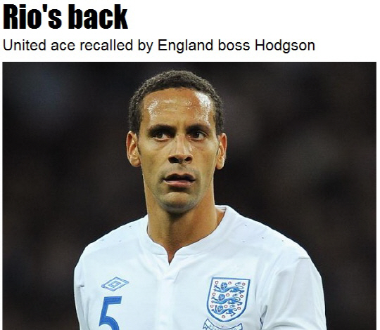 로이 호지슨 잉글랜드 감독은 15일(한국시각) 산 마리노와 몬테네그로와의 2014년 브라질월드컵 유럽예선 경기에 나설 대표팀 명단을 발표했다. 퍼디낸드는 호지슨 감독 체제하에서 처음으로 대표팀에 발탁됐다. 퍼디낸드의 발탁은 뜨거운 감자였다.