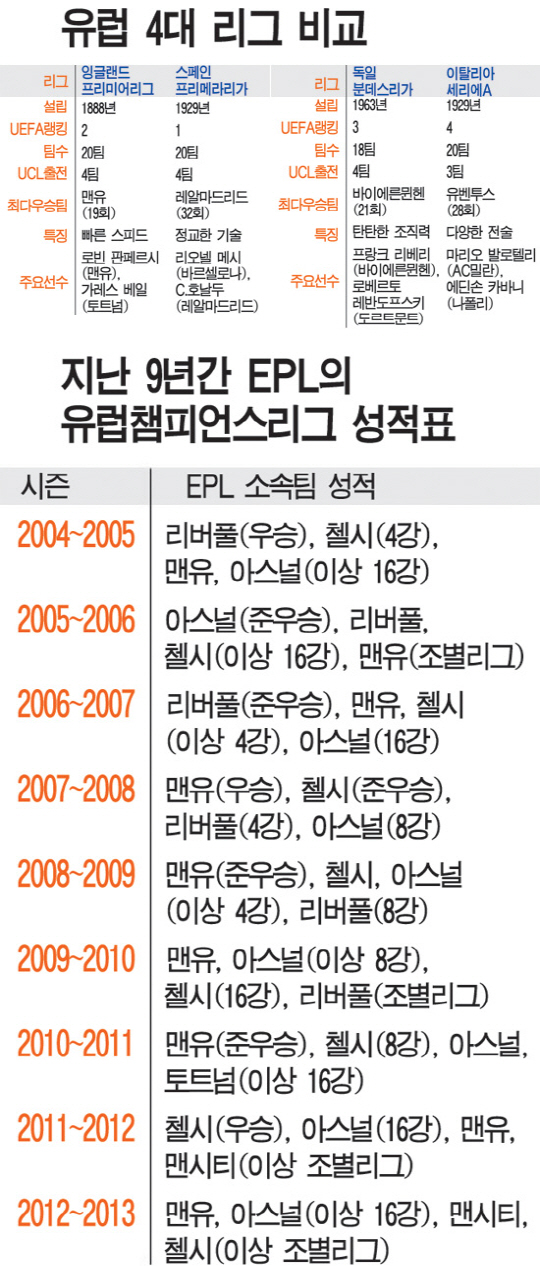 하지만 영원할 것 같았던 EPL의 위상은 4강에 한팀도 이름을 올리지 못한 2009~2010시즌부터 추락하기 시작했다. 올시즌 들어 하향세는 두드러졌다. 첼시와 맨시티가 16강 진출에 실패하더니, 맨유와 아스널마저 8강 문턱에서 좌절했다. 17년 만에 8강에 한 팀도 이름을 올리지 못했다.
