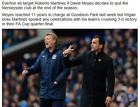 영국 일간지 데일리메일은 에버턴이 모예스 감독이 떠날시 로베르토 마르티네스 영입을 노릴 것이라고 보도했다. 모예스 감독은 11년 동안 에버턴을 이끌었다. 최악의 재정속에서도 팀을 중상위권으로 이끈 명장이다. 모예스 감독은 올시즌을 끝으로 계약이 만료되지만 아직 재계약에 사인하지 않고 있다. 그는 다른 잉글랜드 프리미어리그 클럽이나 해외팀을 이끌고 싶다는 속내를 보인 바 있다.