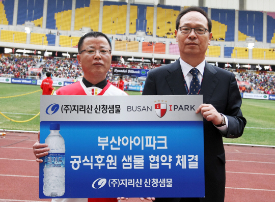 부산은 17일 부산아시아드경기장에서 먹는샘물 전문기업인 지리산산청샘물과 공식 후원샘물 협약 체결을 진행했다.