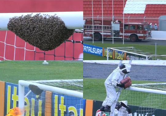 축구장 크로스바에 거대한 벌집이 생겨 경기가 지연되고 소방차가 출동하는 보기드문 소동이 벌어졌다.