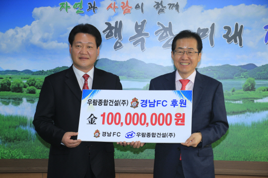 우람종합건설이 후원금 1억원을 19일 경남FC 구단주인 홍준표 도지사에게 전달했다.