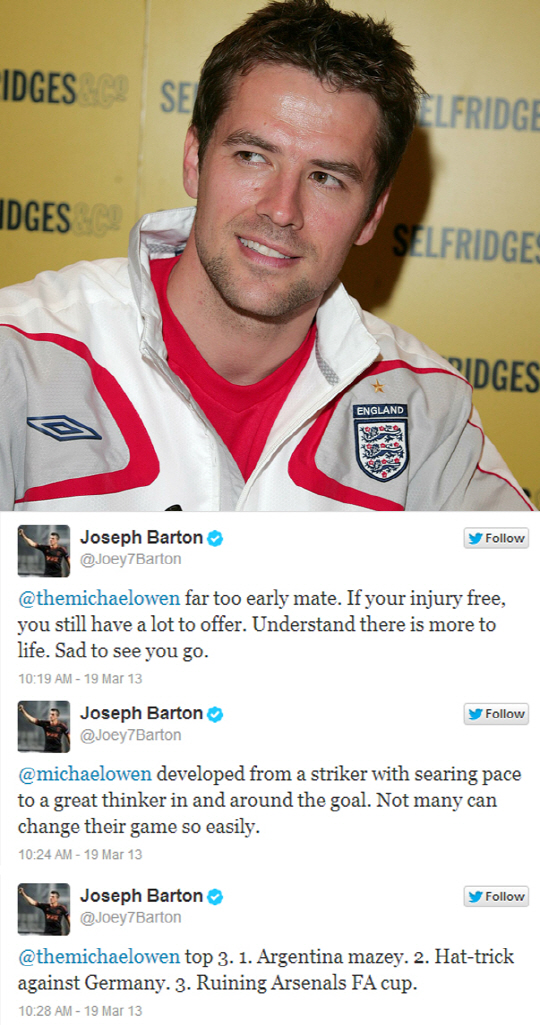 '원더보이' 마이클 오언(33)의 은퇴 소식에 '독설가' 조이 바튼(30)도 경의를 표했다.