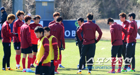 | 축구대표팀이 20일 오후 파주NFC에서 훈련을 하며 오는 26일 카타르를 상대로 치르는 2014 브라질월드컵 아시아지역 최종예선 5차전에 대비했다. 최강희 감독이 훈련에 앞서 선수들을 모아놓고 훈련 목적을 얘기하고 있다. 파주=정재근 기자 cjg@sportschosun.com/2013.03.20/ |