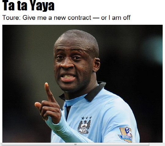 '맨시티의 에이스' 야야 투레가 팀에 최후 통첩을 했다. 투레는 지난 6개월 동안 재계약에 대해 논의하지 않은 것에 대해 강한 불만을 갖고 있다. 투레의 에이전트 디미트리 셀루크는 20일(한국시각) 영국 일간지 더선과의 인터뷰에서 "다음 3~4일 안에 계약서에 사인을 한다면 괜찮다. 만약 그렇지 않다면 우리는 더이상 기다리지 않을 것이다. 다른 클럽과 협상을 시작할 것이다"고 했다. 이어 "토요일까지 기다리겠다. 그렇지 않으면 투레는 5월에 떠날 것이다"고 했다.