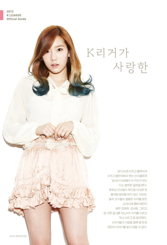K-리거가 뽑은 이상형 1위에 선정됐다. 최근 발간된 '뷰티풀 K-리그'(2013 K-리그 공식 가이드북)가 클래식 14개 구단의 510명과 챌린지 8개 구단의 245명, 총 755명의 선수들에게 이상형을 물은 결과 태연이 으뜸이었다. 755명 중 540명이 질문에 답한 이 설문의 집계 결과 태연은 가장 많은 표를 얻어 이상형 1위를 차지했다. 태연은 포항의 고무열(24)을 비롯한 20대 초중반 선수들에게 큰 지지를 얻었다.