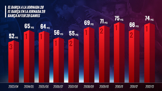 바르셀로나는 현재까지 24승2무2패로 승점 74를 올리고 있다. 같은 시점 승점 75를 올린 2010~2011시즌에 이어 두 번째로 높은 기록이다.
