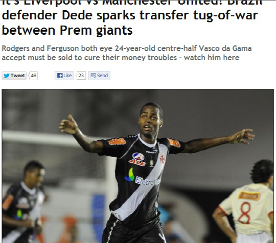 21일(한국시각) 영국 일간지 데일리미러는 '라이벌 관계'인 리버풀과 맨유가 브라질 수비수 데데(바스코 다가마)에게 동시에 러브콜을 보내고 있다고 보도했다. 바스코 다가마는 재정적 압박을 받고 있다. 바스코 다가마는 그들의 가자 큰 자산인 데데를 팔아 재원을 확보한다는 계획을 세웠다. 데데는 탁월한 수비력으로 브라질대표팀 유니폼도 입은 차세대 브라질 최고의 수비수다. 바스코 다가마는 1500만파운드 정도면 데데를 팔 수 있다는 입장이다.