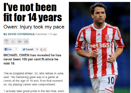 오언이 22일(한국시각) 영국 대중지 더 선과의 인터뷰에서 "나는 19세 이후 정상적인 몸상태로 경기에 뛴 적이 없다. 19세에 당한 햄스트링 부상으로 내 선수생활은 위태로웠다. 그러나 나는 온전한 몸상태가 아님에도 세계적인 클럽에서 높은 수준의 경기력을 보여줬다는 것이 자랑스럽다"고 밝혔다.