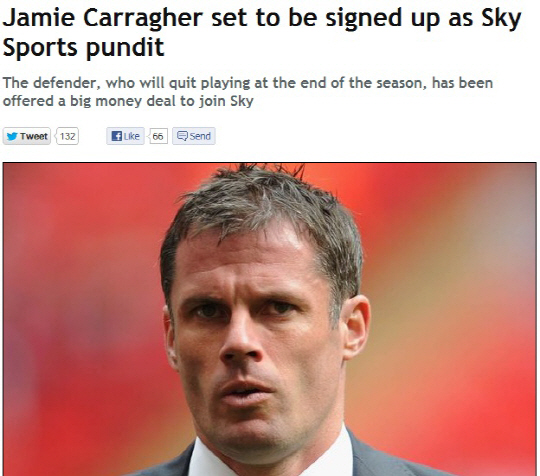 은퇴를 선언한 리버풀의 축구스타 제이미 캐러거가 방송인으로 새출발할 것으로 보인다.