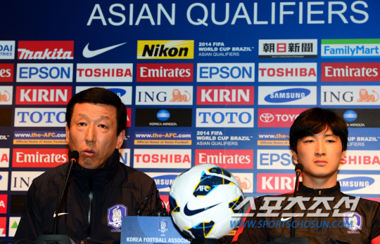 카타르와 브라질월드컵 아시아 최종 예선 5차전 경기를 갖는 최강희호가 경기 하루 전 25일 상암동 서울월드컵경기장에서 훈련을 갖고 최종 점검을 했다. 훈련 전 최강희 감독이 주장 곽태휘와 함께 기자회견을 갖고 필승을 다짐하고 있다. 상암=송정헌 기자 songs@sportschosun.com/2013.3.25 |