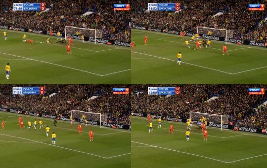 러시아의 역습에 골키퍼 훌리오 세자르(QPR)를 포함해 수비 6~7명이 페널티 박스 안에서 몸을 던져가며 안간힘을 쓰지만 제대로 공을 걷어내지 못한다. 러시아는 공격진 4명이 패스와 슛을 번갈아가며 20초간 브라질 골문을 유린한 끝에 빅토르 파이출린(제니트)이 오른발 슛으로 공격쇼를 마무리했다.