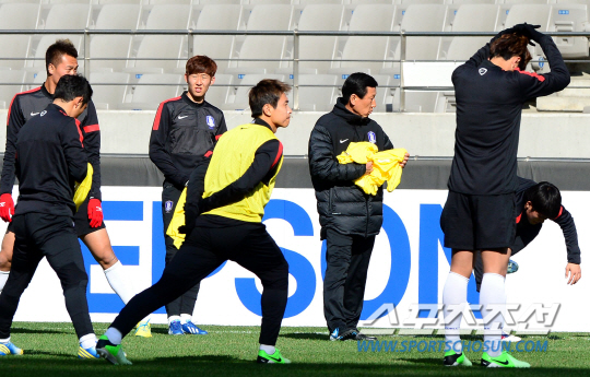 카타르와 브라질월드컵 아시아지역 최종 예선 5차전 경기를 갖는 최강희호가 경기 하루 전 25일 상암동 서울월드컵경기장에서 훈련을 갖고 최종 점검을 했다. 최강희 감독이 선수들에게 조끼를 나눠주고 있다. 상암=송정헌 기자 songs@sportschosun.com/2013.3.25 |