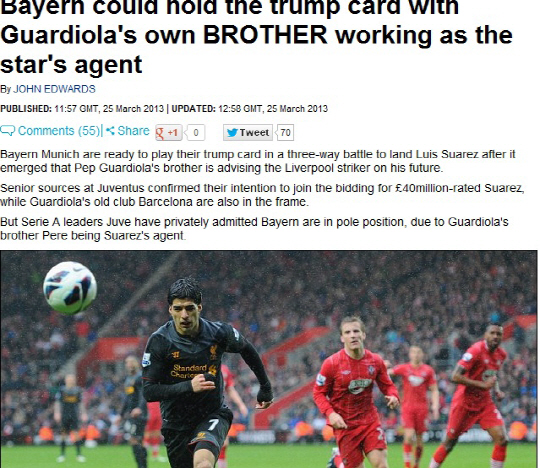 수아레스는 리버풀에서 물오른 기량을 과시하고 있다. 잉글랜드 프리미어리그 득점 선두다. 바이에른 뮌헨과 유벤투스가 그의 영입에 적극적인 모습을 보이고 있다. 수아레스 역시 유럽챔피언스리그에서 뛰고 싶다는 열망을 보이며 리버풀을 떠날 수 있다는 뜻을 내비친 바 있다. 바이에른 뮌헨과 유벤투스의 수아레스 쟁탈전은 바이에른 뮌헨 쪽으로 무게추가 기우는 모습이다.