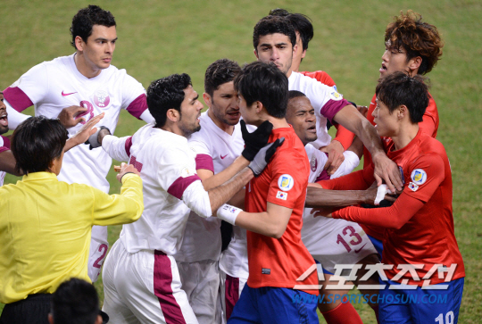 26일 오후 서울 상암월드컵구장에서 2014 FIFA 브라질 월드컵 최종 예선경기 한국과 카타르의 경기가 열렸다. 후반 기성용 등 선수들이 카타르 선수들과 심한 몸싸움을 벌이고 있다. 상암= 김경민 기자 kyungmin@sportschosun.com