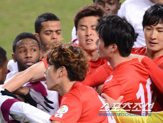 26일 오후 서울 상암월드컵구장에서 2014 FIFA 브라질 월드컵 최종 예선경기 한국과 카타르의 경기가 열렸다. 후반 기성용이 카타르 선수와 몸싸움을 벌이자 구자철이 이를 말리고 있다. 상암= 김경민 기자 kyungmin@sportschosun.com
