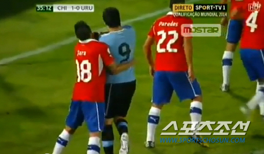27일(한국시각) 칠레 산티아고에서 펼쳐진 2014년 브라질 월드컵 남미 최종예선 칠레전에서 상대 수비수를 교묘하게 주먹으로 때리는 장면이 TV 카메라에 포착됐다. 코너킥 상황에서 자신을 밀착마크하던 칠레 수비수 곤살로 하라의 턱을 강타했다.