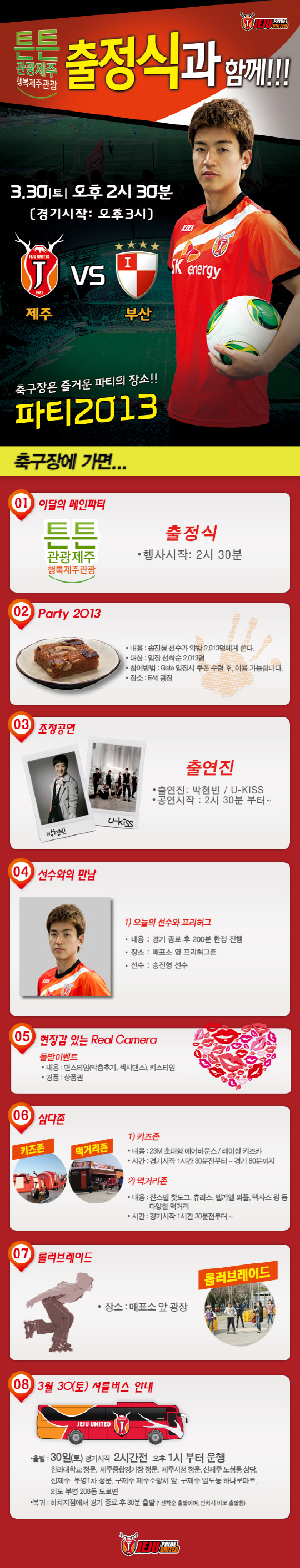이날 경기를 놓칠 수 없는 또 하나의 이유는 제주도민과 함께 하는 축제의 한마당이 펼쳐지기 때문이다. 제주와 제주관광공사는 1000만 시대를 맞아 제주도민의 관광의식 선진화로 튼튼한 관광제주를 구현하고 범도민적 축구붐 조성 및 확산을 위해 경기 시작 30분전부터 우승 기원 및 튼튼 관광제주 출정식을 개최한다. 박현빈, 유키스 등 초청 가수들의 축하공연이 이어지며 'Party 2013'의 오늘의 선수로 나서는 송진형은 선착순 2013명에게 약밥을 무료로 제공한다. 송진형은 경기가 끝난 뒤 선착순 200명과 프리허그를 나누며 팬들과 즐거운 추억을 쌓는다.