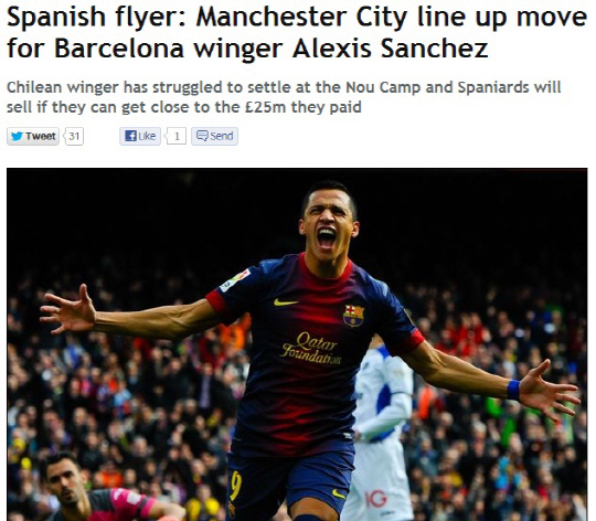 31일(한국시각) 영국 주간지 선데이피플은 맨시티가 바르셀로나의 벤치멤버로 전락한 산체스 영입에 나섰다고 보도했다. 산체스는 2년전만 해도 이적시장의 가장 뜨거운 감자였다. 바르셀로나는 맨유, 맨시티의 경쟁을 뿌리치고 산체스 영입에 성공했다. 그러나 산체스는 생각보다 경기에 나서지 못했고, 바르셀로나는 그의 방출을 고려하고 있다.