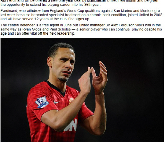 2일(한국시각) 영국 일간지 데일리메일은 맨유는 퍼디낸드에게 1년 연장 계약을 제시했다고 보도했다. 퍼디낸드가 재계약에 서명하면 2002년 팀에 합류한 이래 12년간 맨유에서 뛰게된다. 퍼디낸드는 올시즌을 끝으로 자유계약 신분이 된다. 양 측 모두 신중을 거듭하며 아직 재계약에 동의하지 않았지만, 알렉스 퍼거슨 감독은 경기장 밖에서 보여주는 그의 리더십에 만족감을 표시하며 계약 연장에 대한 의지를 보여줬다. 여전히 깔끔한 그의 수비력이 아직 녹슬지 않았다는 점도 한 몫 했다. 퍼디낸드는 최근 2014년 브라질월드컵 유럽예선을 앞두고 개인적 사정으로 잉글랜드 대표팀을 이탈한 후, 중동에서 해설을 한 것이 알려지며 곤혹을 치르고 있다.
