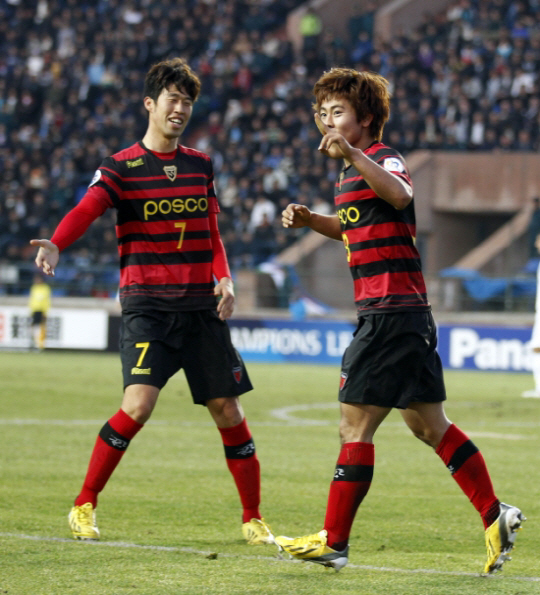 | ◇포항 배천석(왼쪽)과 이광훈이 지난달 14일 우즈베키스탄 타슈켄트의 자르 스타디움에서 열린 분요드코르와의 2013년 아시아챔피언스리그 본선 조별리그 G조 2차전에서 득점 후 환호하고 있다. 타슈켄트(우즈베키스탄)=사진공동취재단 |