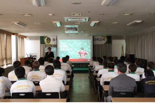 충주 험멜은 3일 오후 4시부터 충주시청 11층 교육장에서 코칭스텝과 선수단을 대상으로 프로의식 강화 교육을 진행했다. 이번 교육은 한국프로축구연맹 한웅수 사무총장을 초청해 약 두시간 가량 진행 되었다.
