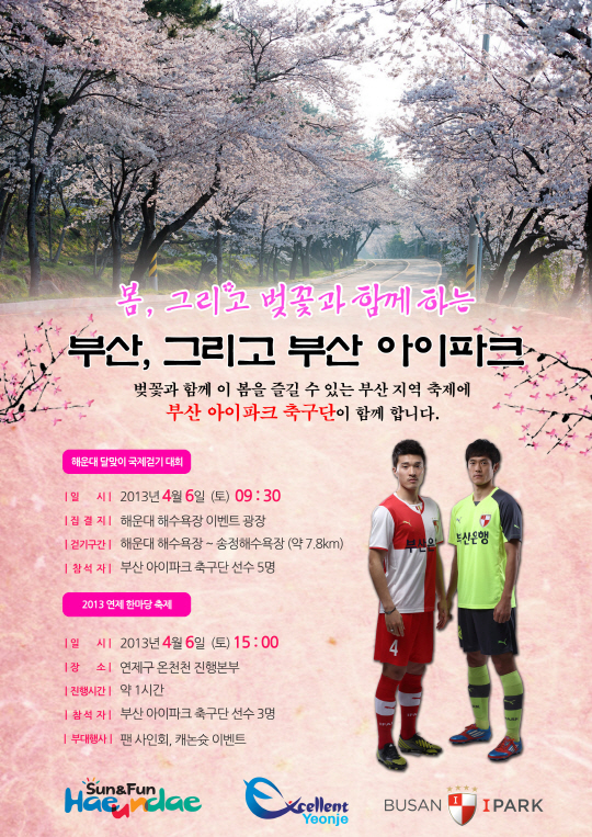 부산은 6일 해운대 달맞이길을 따라 펼쳐질 '달맞이길 국제 걷기 대회'와 연제구에서 진행되는 '2013년 연제 한마당 축제'를 찾을 예정이다. 7일 성남전을 앞둔 빠듯한 일정이지만, 팬들과 선수들이 직접 만나고 소통할 수 있는 계기를 만들기 위해 행사에 직접 참여하게 됐다.